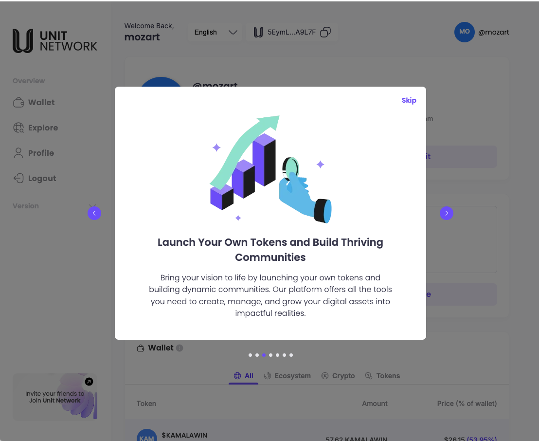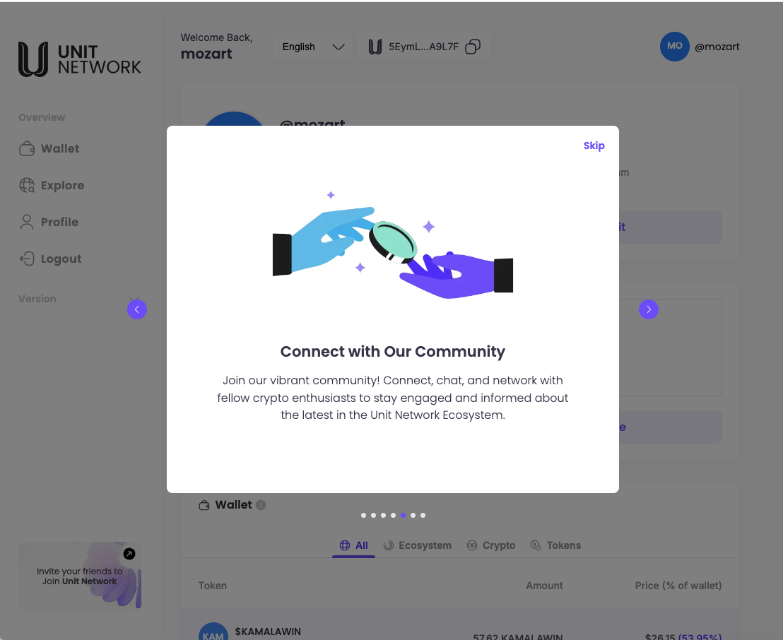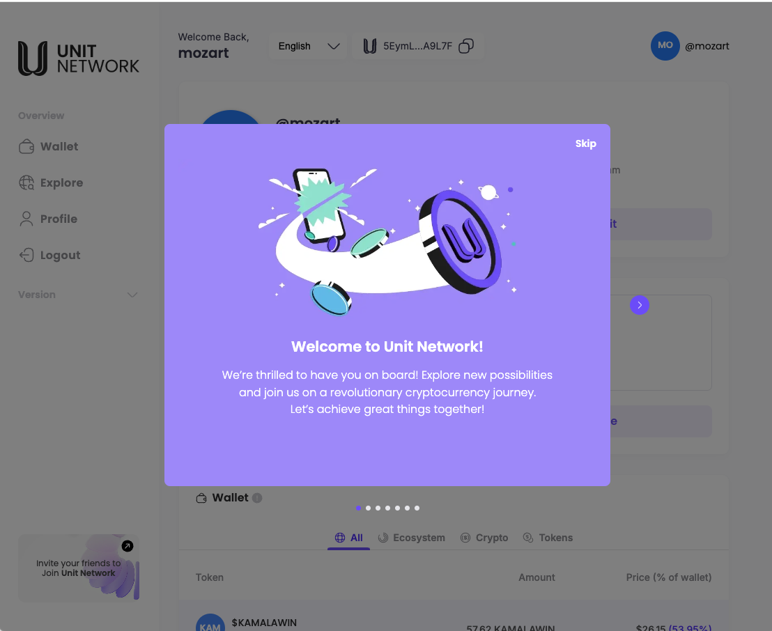 Once logged in, you’ll see a welcome message introducing the Unit App's features. You can either click > to go through the intro or Skip to jump straight to the main dashboard.