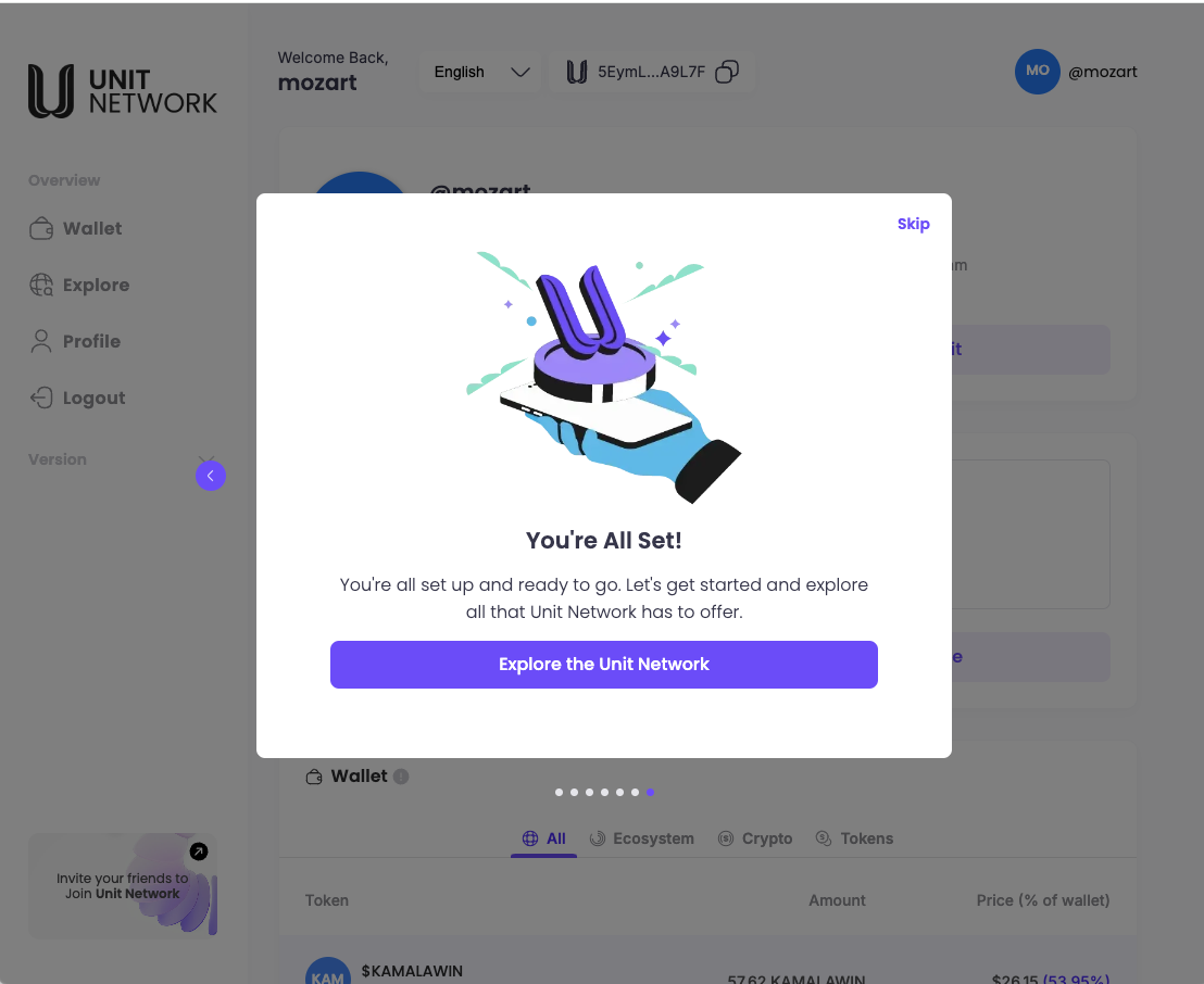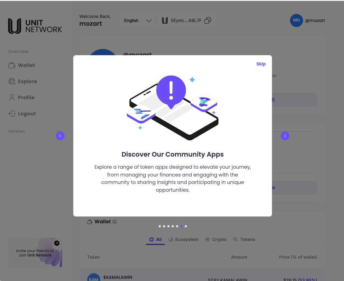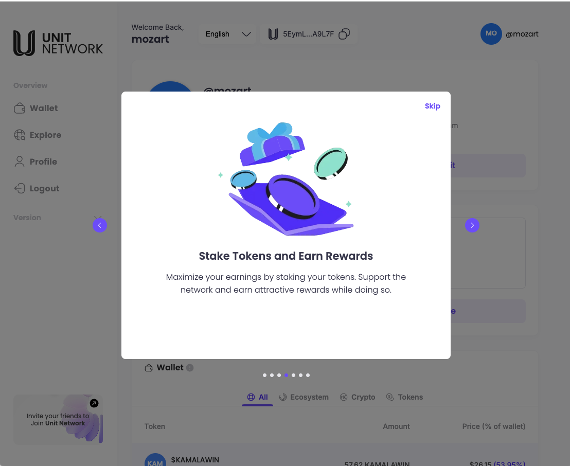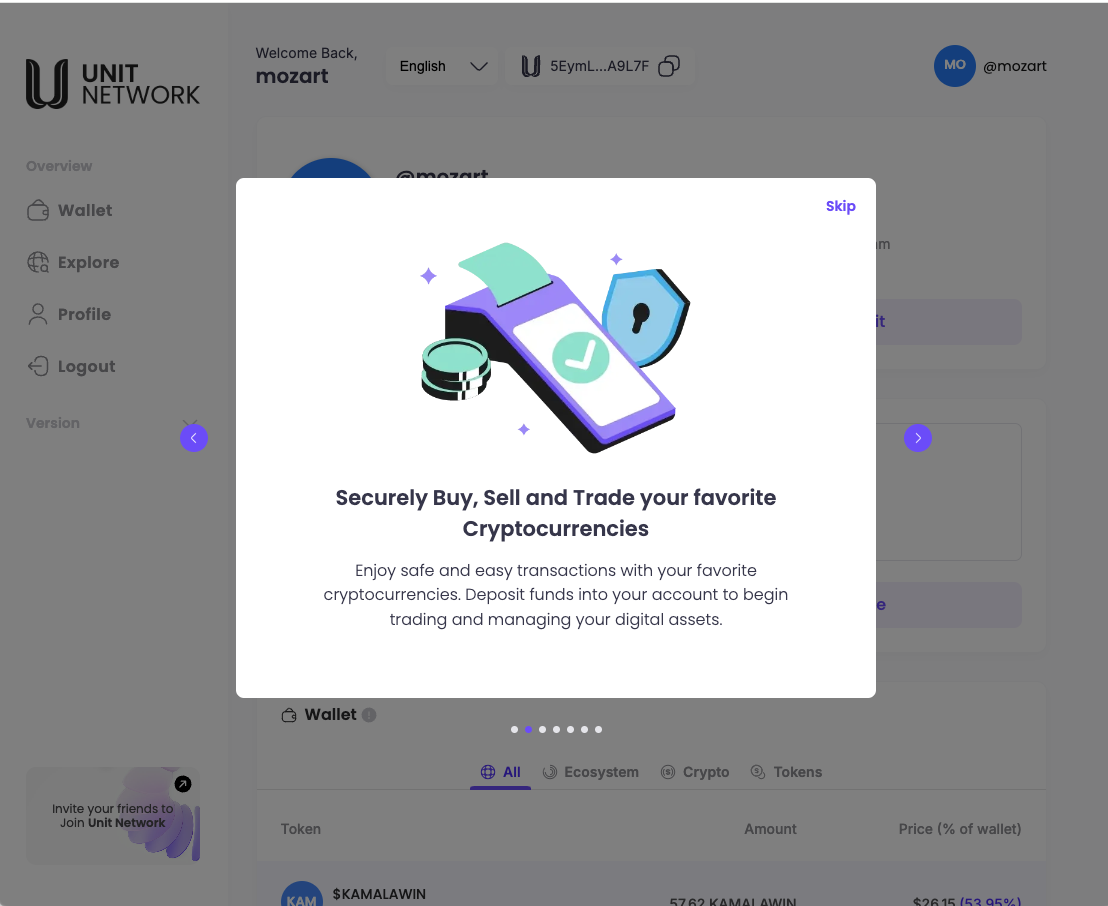 Once logged in, you’ll see a welcome message introducing the Unit App's features. You can either click > to go through the intro or Skip to jump straight to the main dashboard.